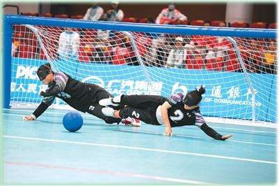 安徽队运动员在盲人门球女子组比赛中扑救。