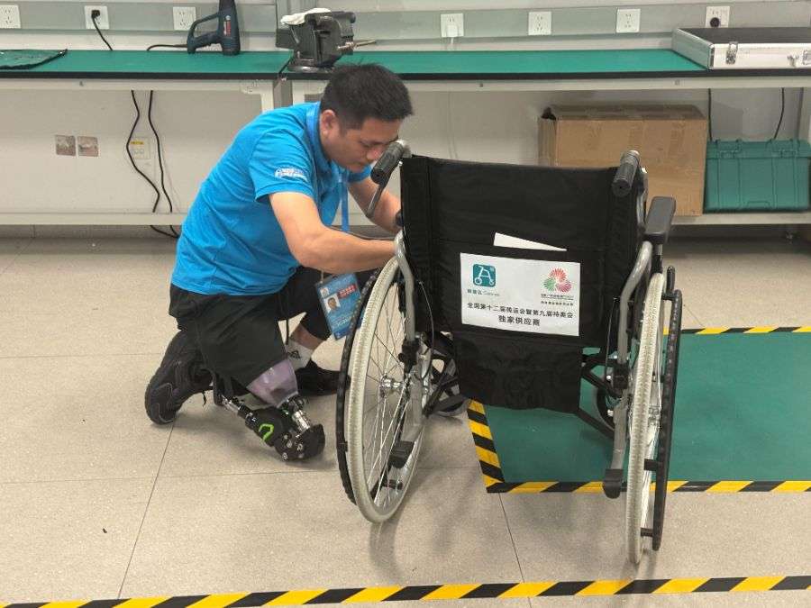 12月9日,全国第十二届残疾人运动会暨第九届特殊奥林匹克运动会田径项目在广东奥林匹克体育中心开赛。走进康复辅具保障服务站,辅助器具维修管理员王楷鹏正在为运动员维修轮椅,他右腿佩戴假肢却行动自如,蹲地检查刹车、扶手、按钮等部件的动作行云流水。