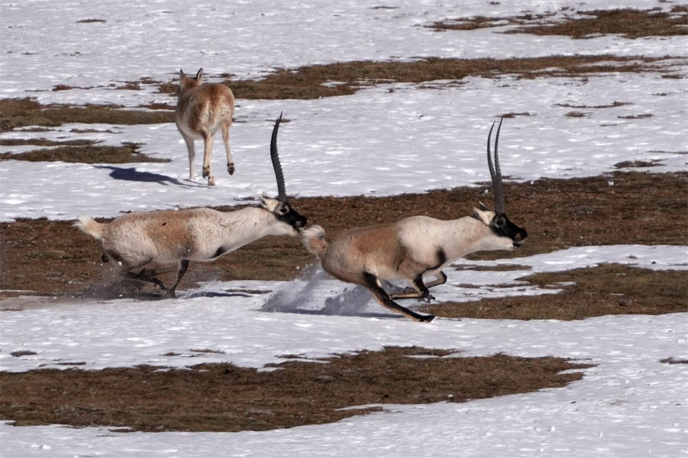 12月19日,西藏那曲市申扎县境内栖息的藏羚羊在追逐打斗。(图片来源:中新社)