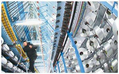 2025年12月15日,江苏省连云港高新区海州工业园,连云港飞雁毛毯有限责任公司加弹车间,工人在生产线上忙碌。耿玉和摄(人民视觉)