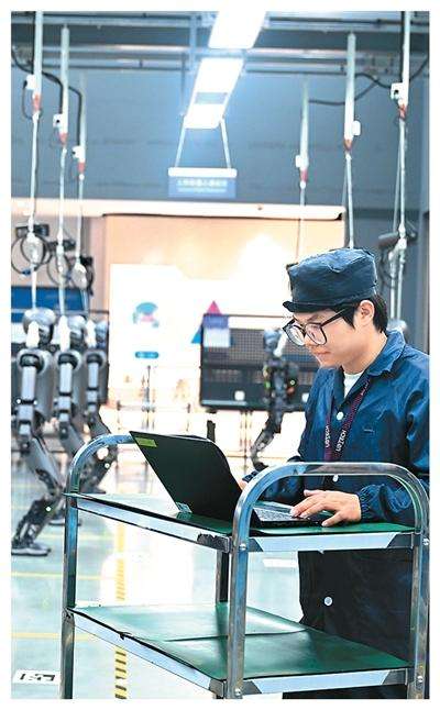 2025年6月18日,在广西壮族自治区柳州市北部生态新区机器人产业园,工人检查工业版人形机器人。黎寒池摄(新华社发)