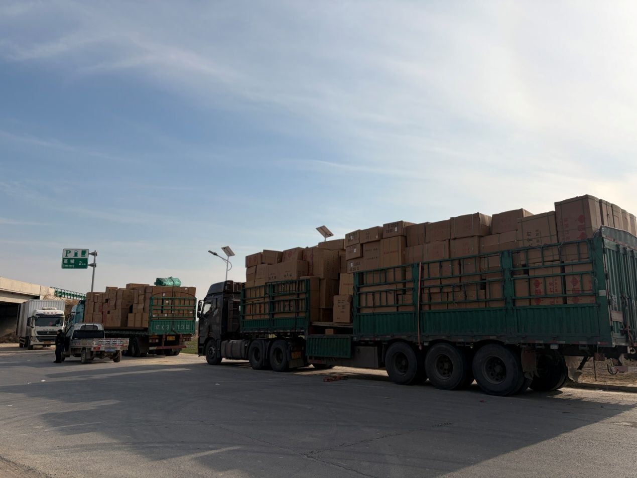 12月26日,屯头村口正在装货的运输车辆,准备将灯笼发往全国各地。(图片来源:李玉素 摄)