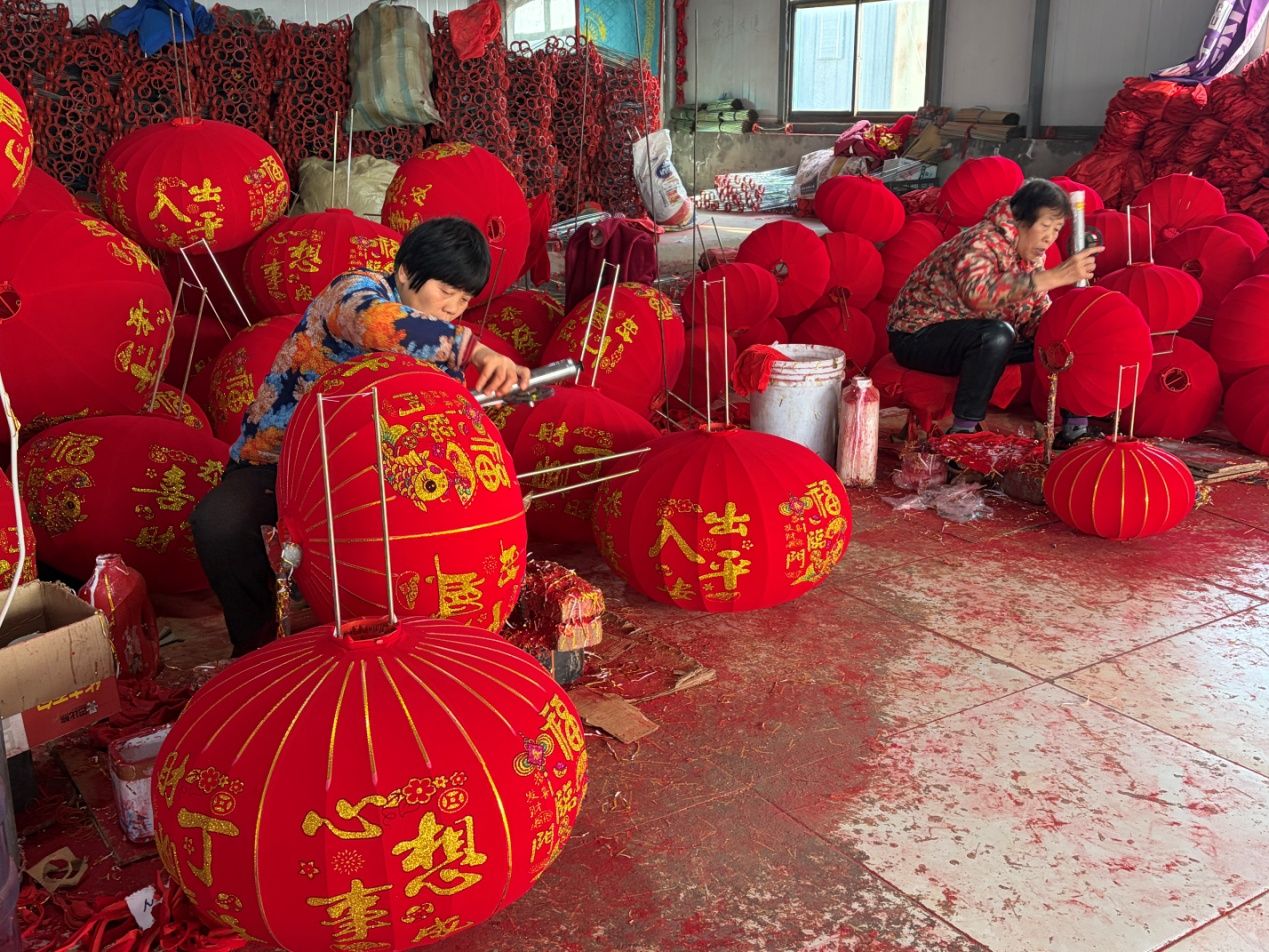 12月26日,屯头村一家灯笼加工厂内,工人们正忙着裱糊红绸、点缀纹饰。(图片来源:李玉素 摄)