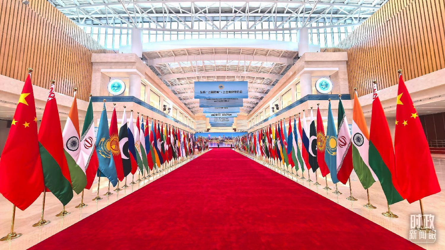 △上合组织天津峰会主会场内的恢弘旗阵。(总台央视记者刘琦拍摄)