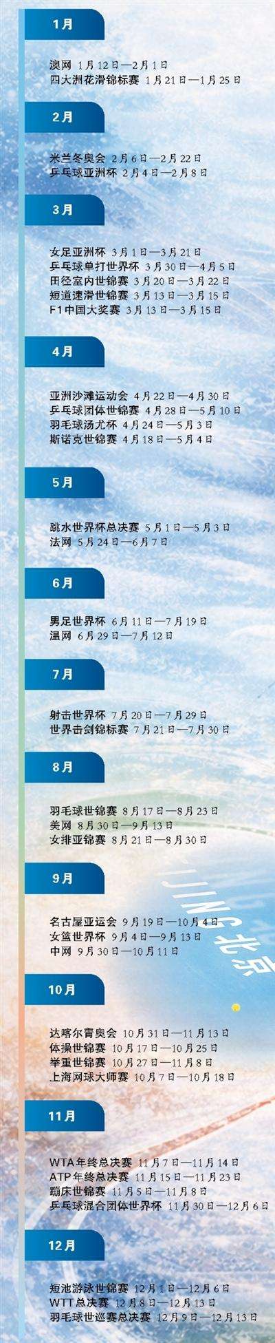 值得一提的是,有多项世锦赛将落地中国。其中,世界举重锦标赛将于今年10月在浙江宁波举行,世界短池游泳锦标赛将于12月在北京举行,江苏南京则将承办蹦床世锦赛。这些顶级赛事的落地,为中国运动员在主场展示实力提供了重要舞台。