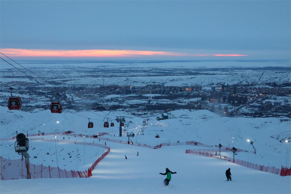 2025年12月26日傍晚,新疆阿勒泰将军山国际滑雪度假区迎来“蓝调时刻”,滑雪者在暮色霞光中滑向城市灯火。(图片来源:中新社)