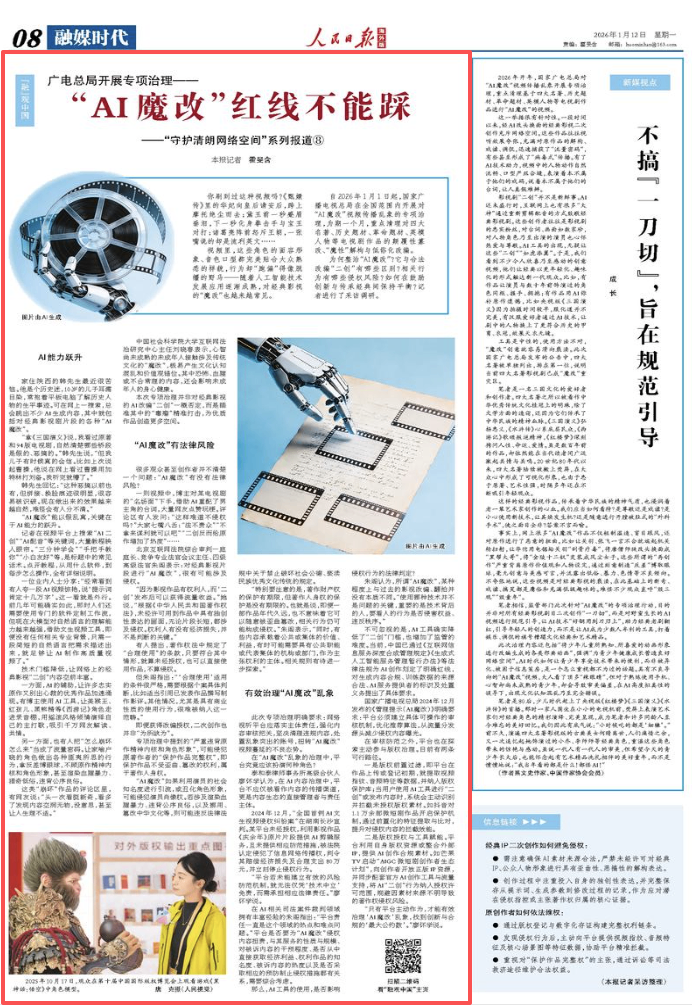 自2026年1月1日起,国家广播电视总局在全国范围内开展对“AI魔改”视频传播乱象的专项治理,为期一个月,重点清理对四大名著、历史题材、革命题材、英模人物等电视剧作品的颠覆性篡改、“魔性”解构与低俗化改编。