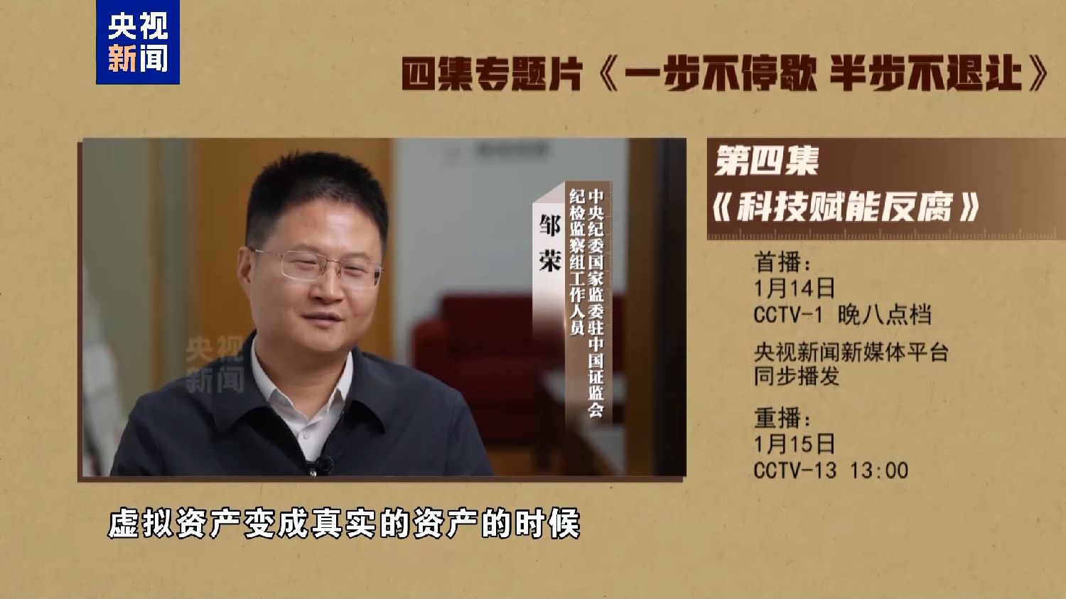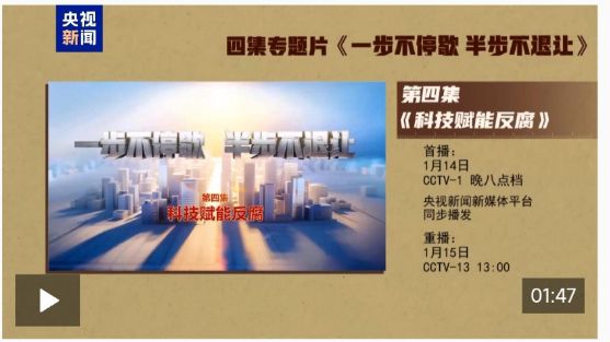 电视专题片《一步不停歇半步不退让》第四集《科技赋能反腐》,讲述纪检监察机关丰富防治新型腐败和隐性腐败有效办法,以信息化赋能正风反腐,充分运用科技手段精准发现不正之风和腐败问题线索、迅速有效突破案件,着力提升智慧反腐、科技反腐水平。总台央视综合频道1月14日晚8点档播出,央视新闻新媒体平台同步播发。