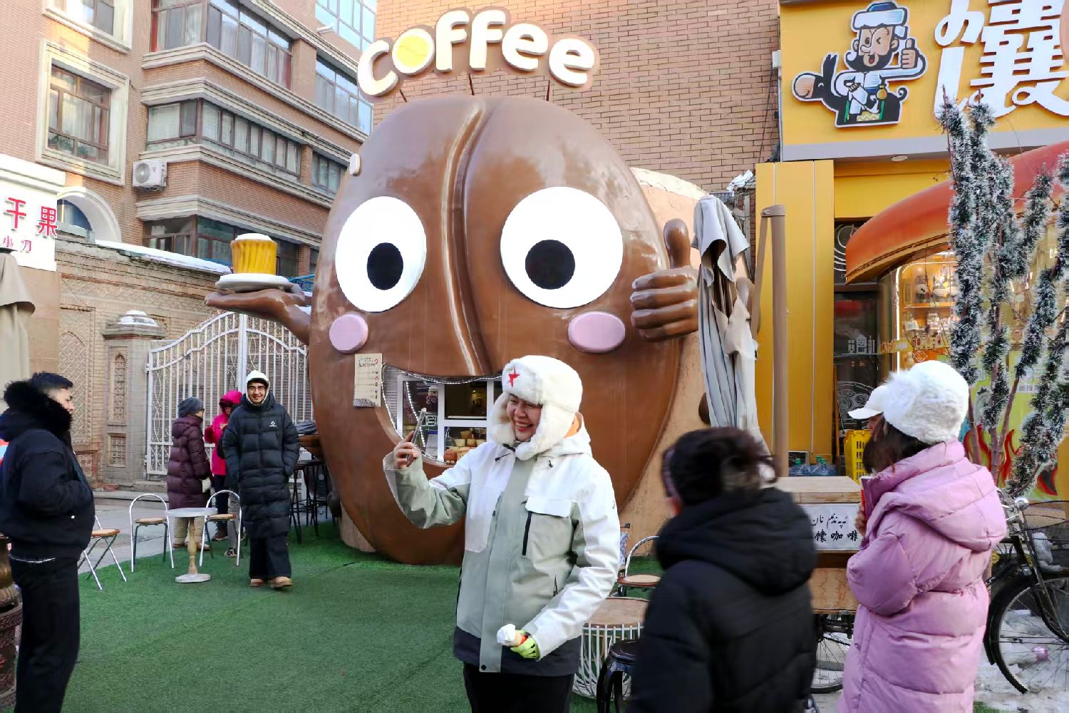 1月12日,在位于乌鲁木齐市的新疆国际大巴扎内,游客在“馕咖啡”摊位前拍照打卡。(图片来源:中新社)