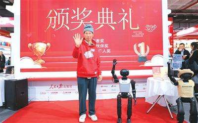 1月8日,第38届北京图书订货会,刘诗利牵着一个人形机器人的手,出现在人民日报出版社展位上。人民日报出版社社长丁丁向他授予了“人民日报出版社优秀阅读推广人”的荣誉证书。