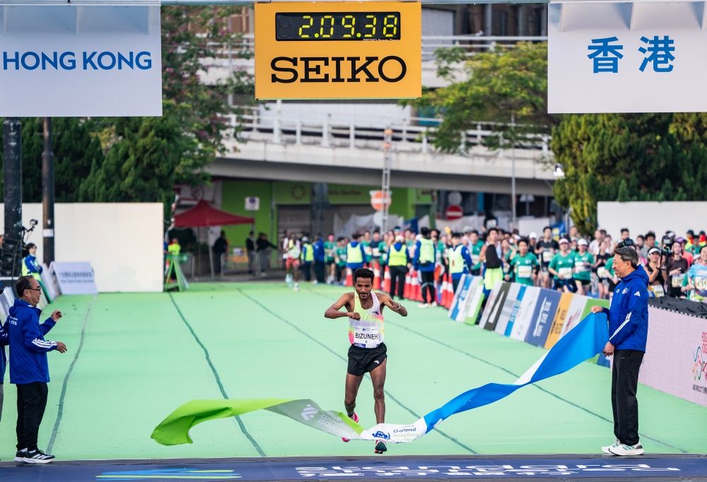 1月18日,2026年渣打香港马拉松开跑,约7.4万名跑者参加全程马拉松、半程马拉松、10公里跑等各组别赛事。埃塞俄比亚选手比祖内赫·贝拉丘(Bizuneh Melaku Belachew)以2小时09分39秒的成绩获得全程马拉松男子组冠军。图为比祖内赫·贝拉丘(中)在终点冲线。(图片来源:本文图片均自中新社)
