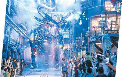 2025年8月17日,在机械巨兽IP主题街区——安徽省淮北市夔牛天街,许多家长带着孩子在游玩。王文摄(人民视觉)