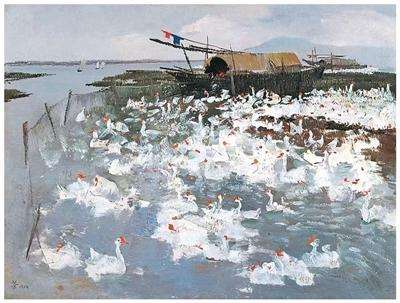 这句话中的“这幅画”,是指李可染创作于20世纪50年代的新年画《劳动模范游园大会》,描绘了1950年9月,参加全国第一届劳动模范代表大会的工农劳模一起逛游北海公园的场景。