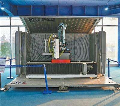 河北“雄安之翼”主楼一层的“胶囊工厂”内,3D打印机在打印外墙板材。赵伟彤摄