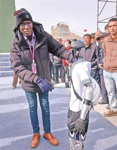 在第十一届新疆特色果品(阿克苏)交易会开幕式上,巴尔德与人形机器人互动。