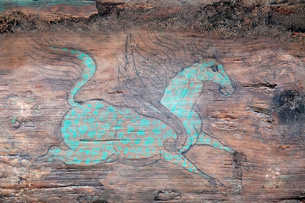 2月4日,“新疆吐鲁番市巴达木东晋唐时期墓群”入选2025年中国考古新成果。图为2月3日,在中国社会科学院科技考古与文化遗产保护重点实验室考古方舱拍摄的该墓群出土棺木上展翅的飞马彩绘。(图片来源:中新社)