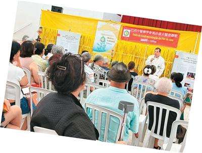 不久前,在巴西中医药学会执行会长叶富坤、会长罗绍宗与副会长马佩玲率领下,由28名医师组成的义诊团队前往圣保罗市郊外一个居民区,举行医患联欢午餐茶会。期间叶富坤为病患讲解养生保健方法。随后,义诊队前往圣保罗州附近柯帝亚市一所老人联谊中心,举行义诊医患联谊活动。当地数十名老人、市政府官员聆听了叶富坤关于中医治未病的讲座。