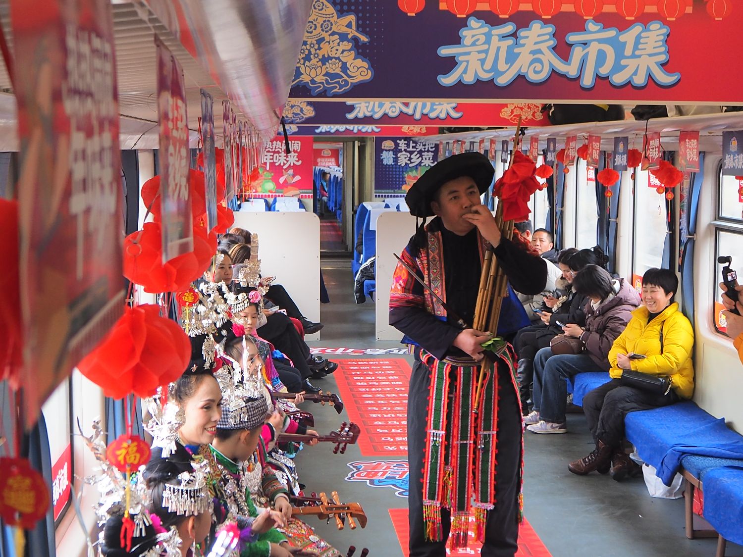 在“非遗工坊”车厢,有苗绣制作、黔东南州歌舞团演员表演独具民族风情的歌舞,以及凯里市书法协会成员为游客写的新春祝福对联。