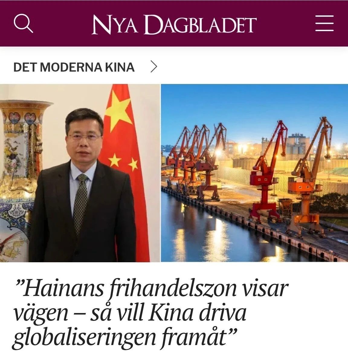 2026年2月13日,驻瑞典使馆临时代办万德刚在瑞媒体《新日报》发表署名文章《中国繁荣发展为全球经济增长注入强大动力》,全文如下: