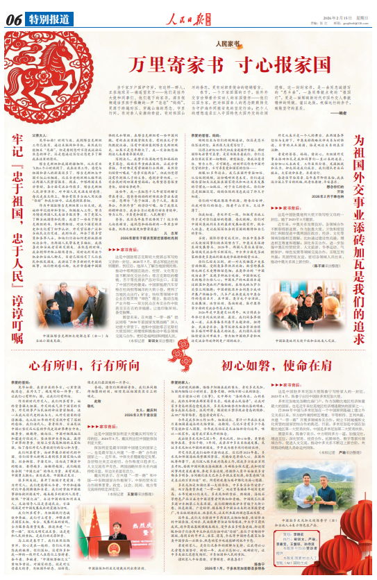 春节,一个万家团圆的日子,驻外外交官诠释着朴实动人的家国情怀——他们以国为家,把对祖国亲人的思念默默转化为守护海外同胞安危的坚定行动;把个人的理想追求汇入中国特色大国外交的壮阔进程。这一封封家书,是一曲用忠诚谱写的“思乡曲”,一盏用奉献点亮的“报国灯”,更是一面辉映新时代中国外交人奉献精神的明镜。谨以此版,祝福远行的赤子,致敬坚守的星辰。