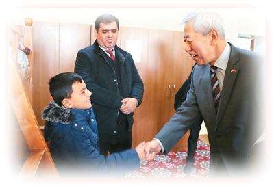 中国驻塔吉克斯坦大使郭志军(右一)与当地小朋友见面。