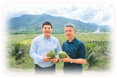 中国驻多米尼加大使陈鲁宁(右)和当地人士展示特色农产品。