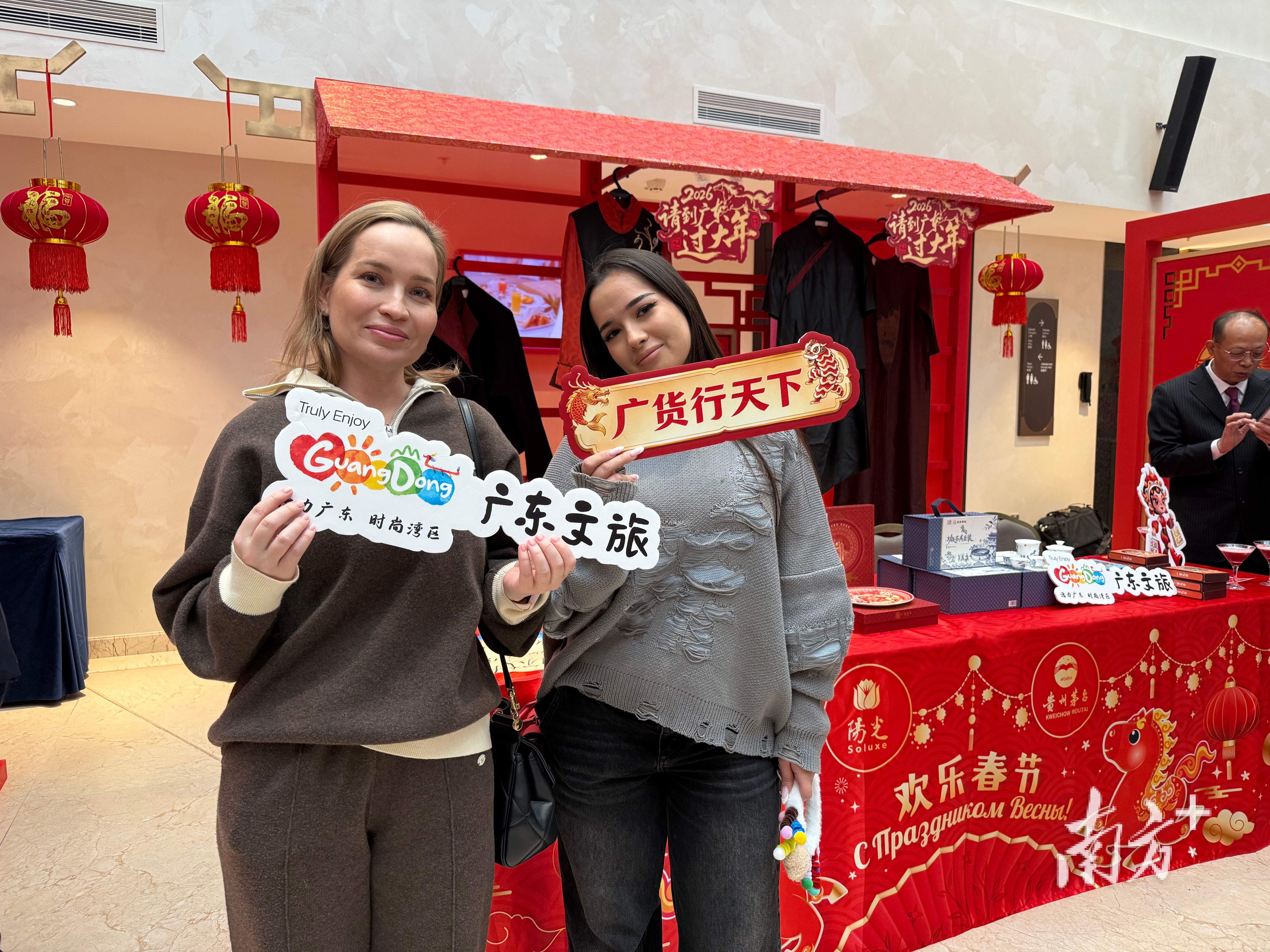 活动现场,中俄两国嘉宾纷至沓来。俄罗斯杜马第一副主席伊万·梅利尼科夫心情激动地敲响英歌鼓点,并为活动发表新年致辞。现年91岁的中华人民共和国“友谊勋章”获得者、俄中友好协会第一副主席加林娜·库利科娃也亲临现场,为广货助力打Call。她表示自己十分喜爱来自广东的香云纱。不少嘉宾还手持冰箱贴拍照“打卡”。