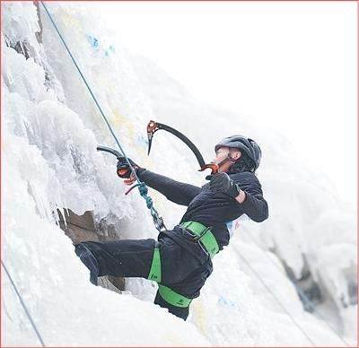 攀冰爱好者在青海西宁市湟源县大黑沟旅游景区攀冰场内攀冰。