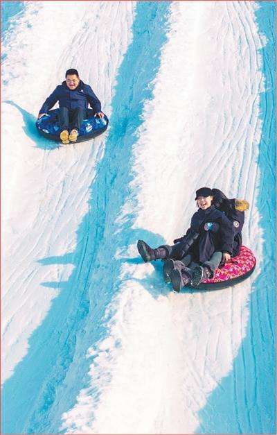 游客在江苏宿迁市泗洪县青阳街道游乐园体验冰雪项目。