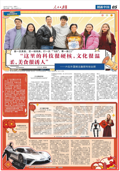 冬日的安徽省合肥市暖阳正好,蔚来汽车F2工厂的门口格外热闹:举着运动相机的匈牙利博主“大卫在中国”正对着镜头比画着合肥字样的手势,俄罗斯博主“俄罗斯丽雅”用一口流利中文和工作人员“唠嗑”,巴基斯坦博主“歪果仁在太原”捧着手机对着远处的展厅不停抓拍,会讲三国语言的澳大利亚博主“胖虎在广东”哼起了自编的合肥打卡小调……1月28日至29日,6位外国博主跟随“领略传统 遇见未来——探寻合肥高质量发展”采风团来到合肥,参加一场以“尝一次美食、赏一场戏曲、打一次‘飞的’、看一座工厂”为主题的科创合肥探店之旅。当外国博主们的镜头遇上合肥的硬核科技与温柔传统,一场跨越国界的趣味探索,让这座城市的科创密码与文化魅力在欢声笑语中被一一解锁。
