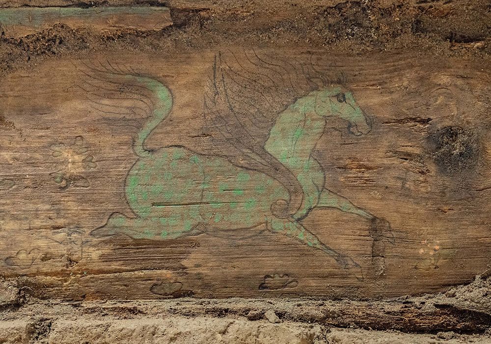 日前,新疆文物考古研究所与中国社会科学院科技考古与文化遗产保护重点实验室在北京联合对外公布新疆吐鲁番巴达木东墓群M20取得重要考古发现。这是在实验室考古方舱内拍摄的墓葬M20出土的木棺座壸门内的彩绘“翼马”图案。(图片来源:新华社)