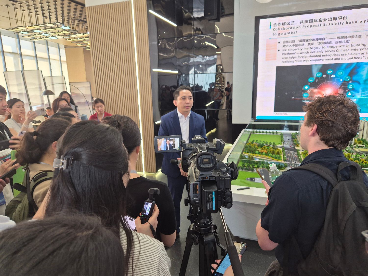 记者团首站抵达海南自由贸易港13个重点园区之一的海口复兴城互联网信息产业园。这里以“一区两翼”格局为核心,正全力打造自贸港先行区、国际总部集聚区和数据跨境流动示范区。园区聚焦数字贸易、数字智能、国际总部和专业服务四大核心赛道,已吸引阿里巴巴、小米集团、施耐德、特斯拉等全球领军企业入驻,累计注册企业超7000家。2024年,园区营收突破1600亿元,成为驱动海南自贸港高质量发展的强劲数字引擎。记者们对园区依托跨境数据流动试点优势,深耕跨境电商、游戏出海、人工智能大模型等前沿领域的发展路径表现出浓厚兴趣。