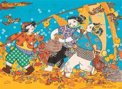 丰收是年画的传统主题,蕴含着浓郁的乡土情怀。作品《鱼满仓·笑满岸》以渔村丰收为背景,描绘渔民满载而归的喜悦场景,画面中孩童欢笑、鱼虾满仓,传递“年年有余”的美好寓意。《向幸福出发》表现人们划船采莲的热闹场面,满塘的荷花莲蓬供人采摘,也是人们奔向幸福的生动写照。《金沙滩上赶海忙》描绘了渔民赶海的场景,三个渔家女子笑容满面,手里、怀抱里皆是赶海的收获,作品色彩欢快明亮,气氛热烈,充满幸福感。