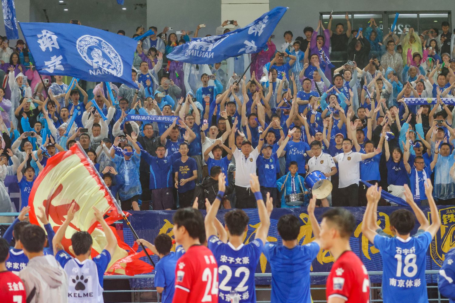 2025年6月21日晚,江苏常州,球迷在雨中为获胜的南京队球员加油。(图片来源:中新社)