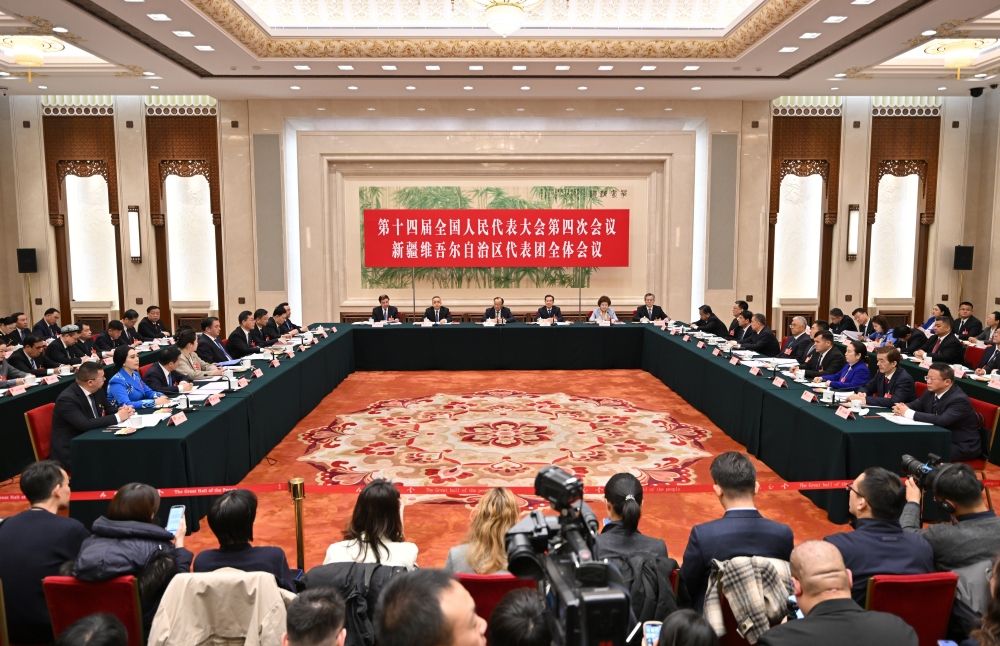 3月6日,十四届全国人大四次会议新疆维吾尔自治区代表团举行开放团组会议。(图片来源:中新社)