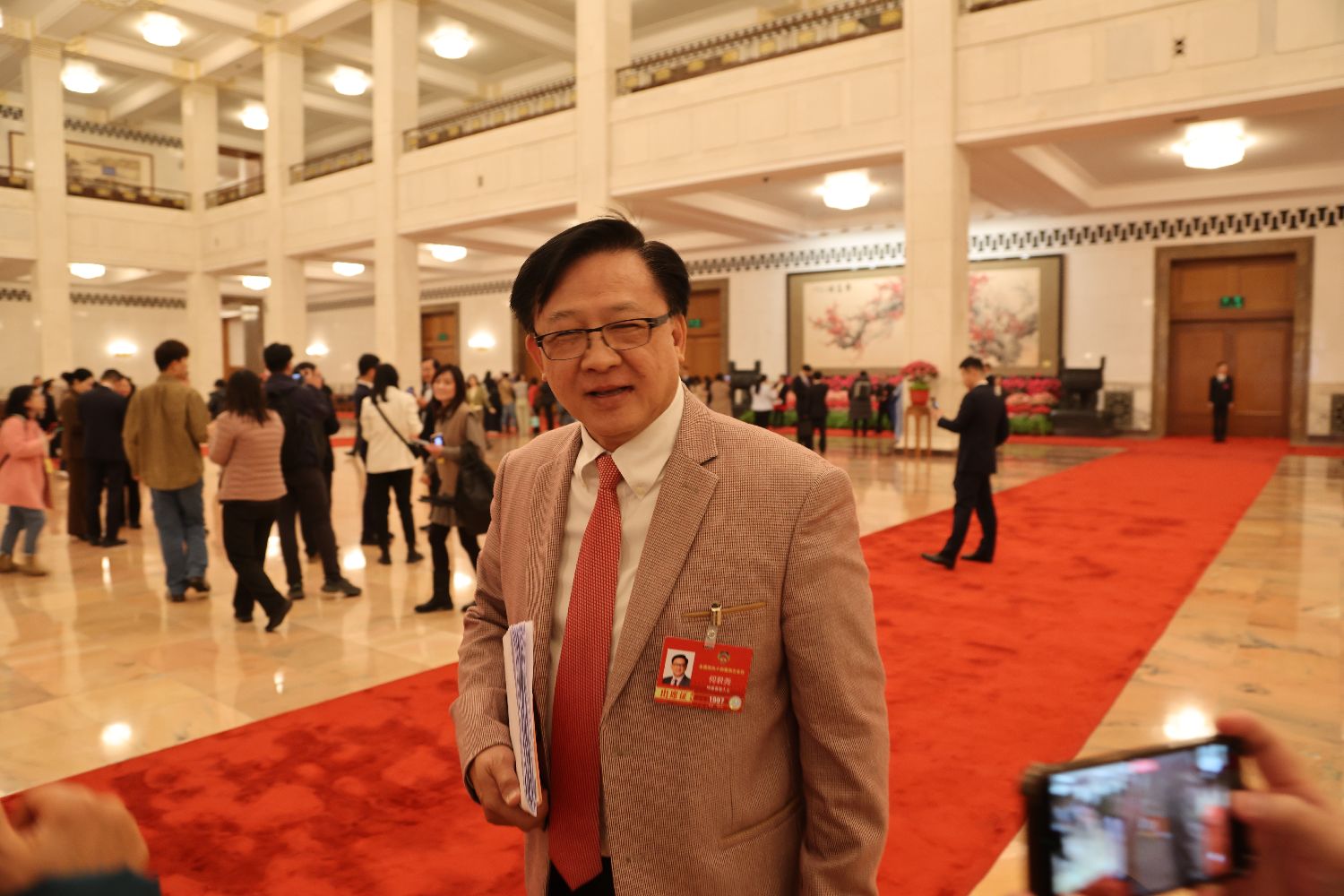 他一身浅色西装,红色领带,胸前佩戴着全国政协委员证件。站在红地毯边的灯光之下,他的神情显得沉稳而坚定。许多人在大厅里匆匆而过,而他却像一位老派的绅士,既有法律人的理性,又带着一种江湖义气般的豪爽。