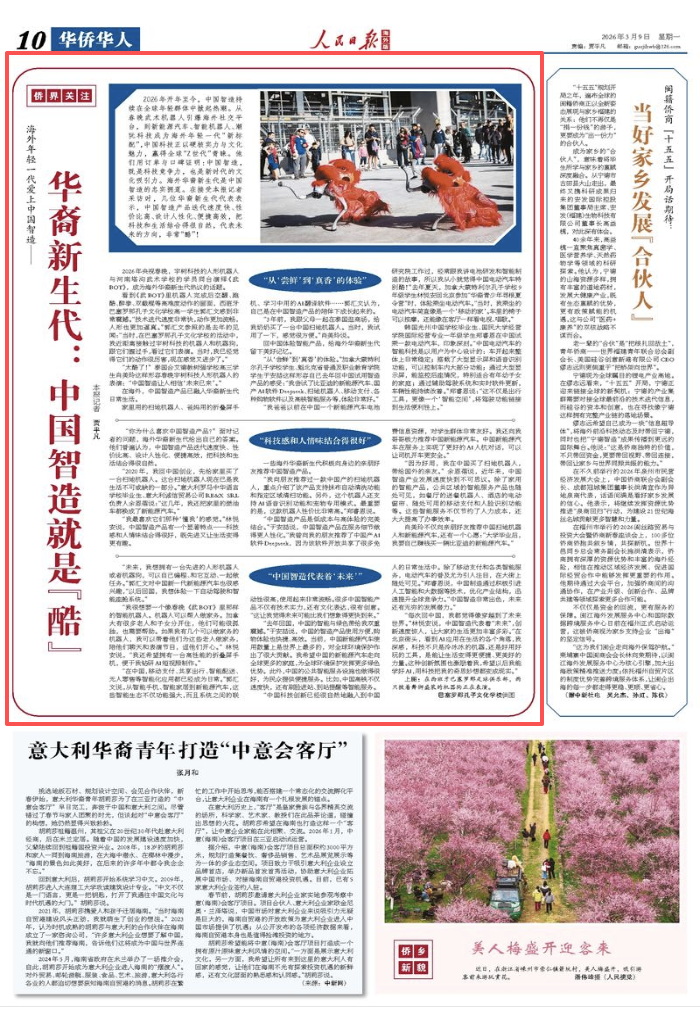 2026年开年至今,中国智造持续在全球年轻群体中掀起热潮。从春晚武术机器人引爆海外社交平台,到新能源汽车、智能机器人、潮玩科技成为海外年轻一代“新标配”,中国科技正以硬核实力与文化魅力,赢得全球“Z世代”青睐。他们用订单与口碑证明:中国智造,既是科技竞争力,也是新时代的文化吸引力。海外华裔新生代是中国智造的忠实拥趸。在接受本报记者采访时,几位华裔新生代代表表示,中国智造产品迭代速度快、性价比高、设计人性化、便捷高效,把科技和生活结合得很自然,代表未来的方向,非常“酷”!
