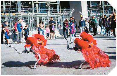 在西班牙巴塞罗那足球俱乐部,两只披着舞狮盛装的机器狗正在表演。