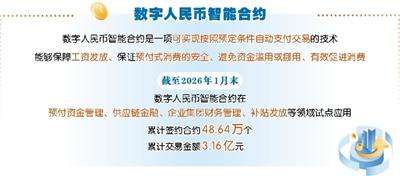 最新数据显示,截至2026年1月末,数字人民币智能合约在预付资金管理、供应链金融、企业集团财务管理、补贴发放等领域试点应用,累计签约合约48.64万个,累计交易金额3.16亿元。