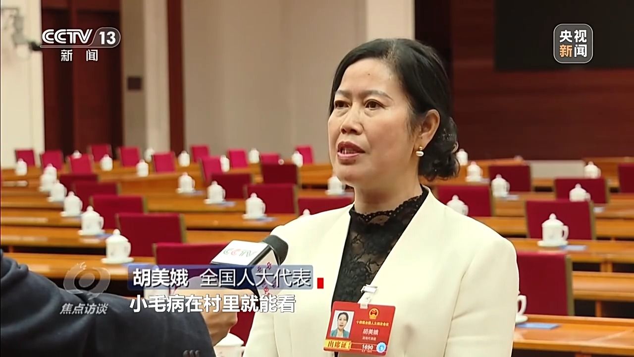全国人大代表胡美娥:村里的卫生室配齐了常用药和基础诊疗设备,还有乡镇医生定期下乡坐诊,小毛病在村里就能看。