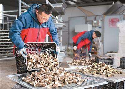 3月15日,在位于湖北省宜昌市远安县旧县镇的一家农业公司,工作人员摊铺新鲜羊肚菌。