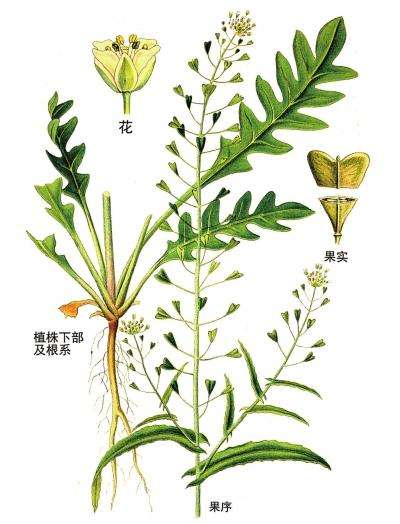 植物学描述:十字花科荠菜属一年生或二年生草本。植株矮小,基生叶莲座状。叶片羽状分裂,有毛。花白色,总状花序。果实为倒三角形的短角果。