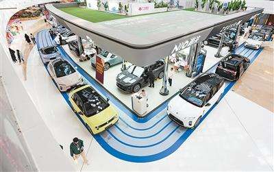 北京市朝阳区一家商场内,市民在了解新能源汽车。
