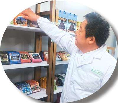 图为孟新力在公司展柜前展示巧克力成品。受访者供图