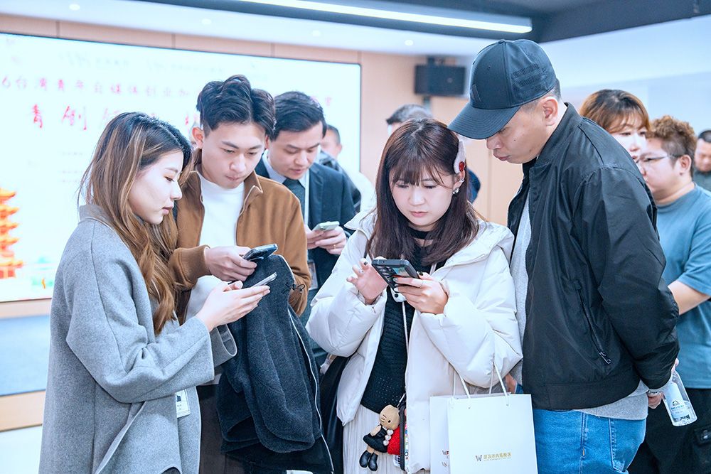 3月18日,在武汉武商江豚网直播基地,两岸自媒体从业者互换联系方式。(图片来源:中新社)