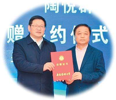 陶悦群(右)捐赠设立安徽医科大学“陶悦群奖创基金”。