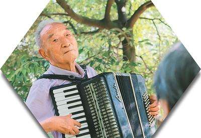 90岁的银发博主王爷爷在公园中为老伴表演手风琴。受访者供图