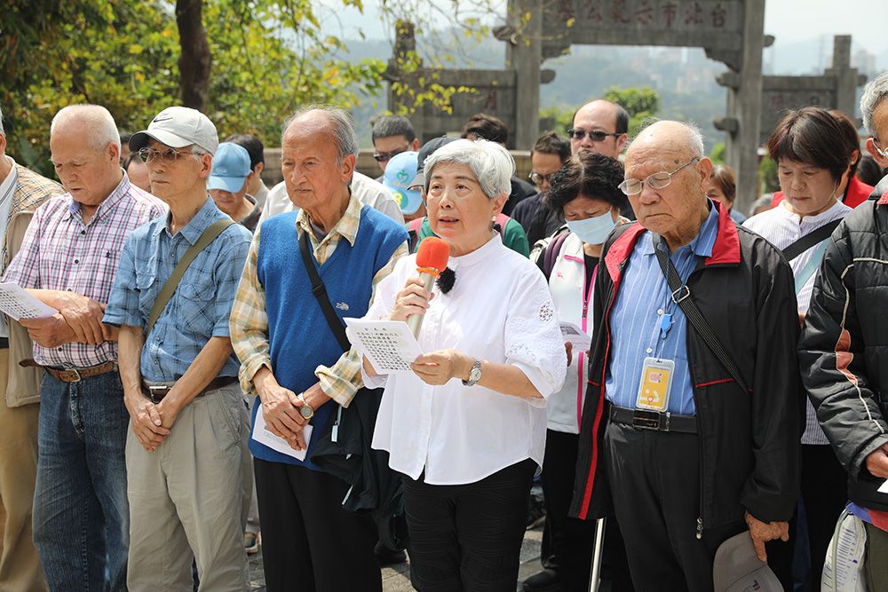 3月24日,台湾地区政治受难人互助会在台北六张犁墓区举办春祭追思活动,悼念在白色恐怖时期牺牲的先烈。图为台湾地区政治受难人互助会总会长李素慧(前排右二持话筒者)宣读祭文。(图片来源:中新社)
