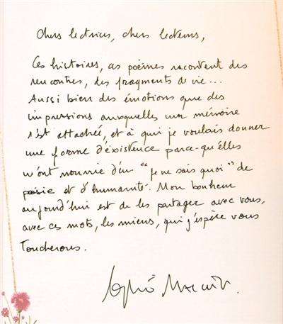 (我的)故事和诗歌,讲述的是一次次相逢的瞬间、一个个生活的片段……还有那些萦绕在记忆中的情感与印象。我想赋予它们一个存在的形式,因为它们曾用某种“我不知道是什么”的诗意和温情滋养了我。今天,我的喜悦就是将它们与你们分享,希望这些文字,我的文字,能触动你们的心弦。