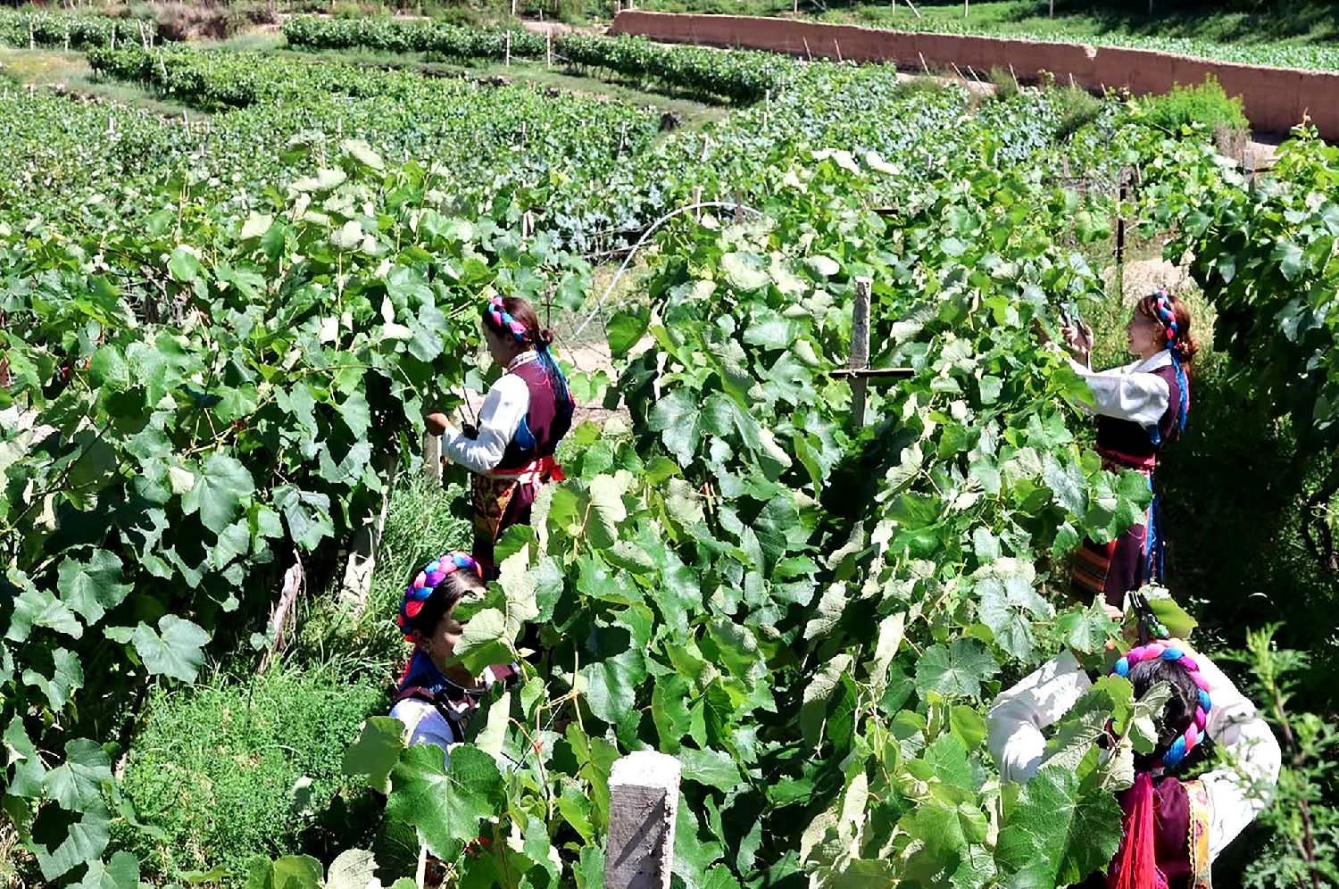 2025年夏天,工人们在西藏芒康县一葡萄园里进行夏季管理。(图片来源:受访者供中新社图)
